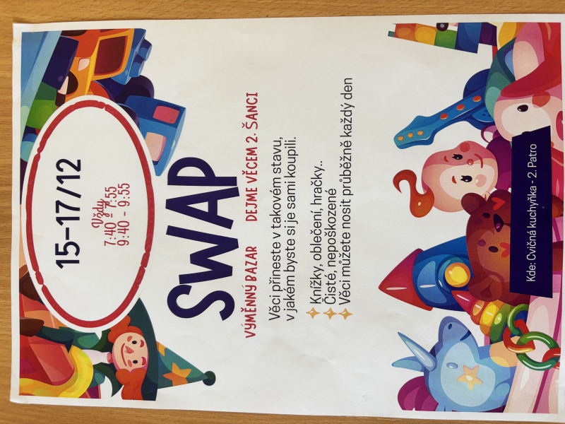 Tento týden se u nás uskutečnil swap neboli výměnný bazárek. Žáci z celé školy mohli nosit nepotřebné hračky, šperky, knihy a různé zajímavosti, které chtěli nabídnout spolužákům. Žáci z bazárku odcházeli spokojeni a s úsměvem na tváři.