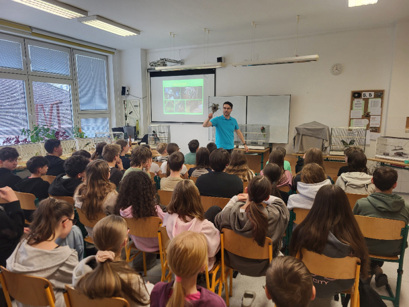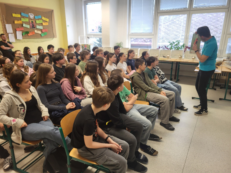 Dnes se 7. třídy zúčastnily díky paní učitelce Peřinové přednášky živého chovatelství. S dopomocí prezentace, krátkých videí, pohybových aktivit a živé expozice byly dětem představeny základní chované i vzácné druhy exotického ptactva. Živou expozici tvořilo 18 druhů o 28-32 jedincích. Dětem byla vysvětlena stavba ptačího těla, prostor byl i pro zajímavosti a zážitky z odborné praxe a také pro dotazy a případné sdílení chovatelských úspěchů dětí.