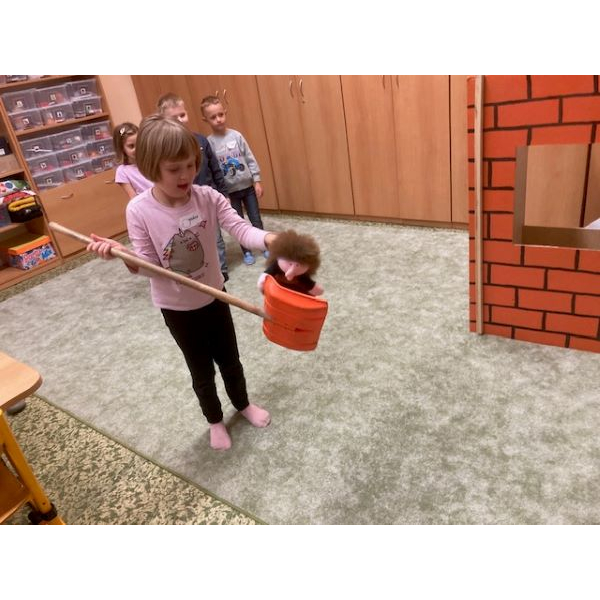 Velkým zážitkem bylo také zdobení perníčků geometrickými tvary podle instrukcí učitele. Děti si procvičily nejen tvary a barvy, ale i trpělivost a spolupráci. A protože pohádka musí mít napínavý konec, nechyběla ani dramatizace – ježibabu děti společně hodily do pece, samozřejmě jen „jako“ a s velkým smíchem.