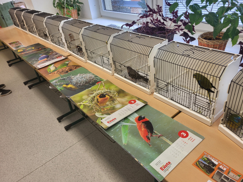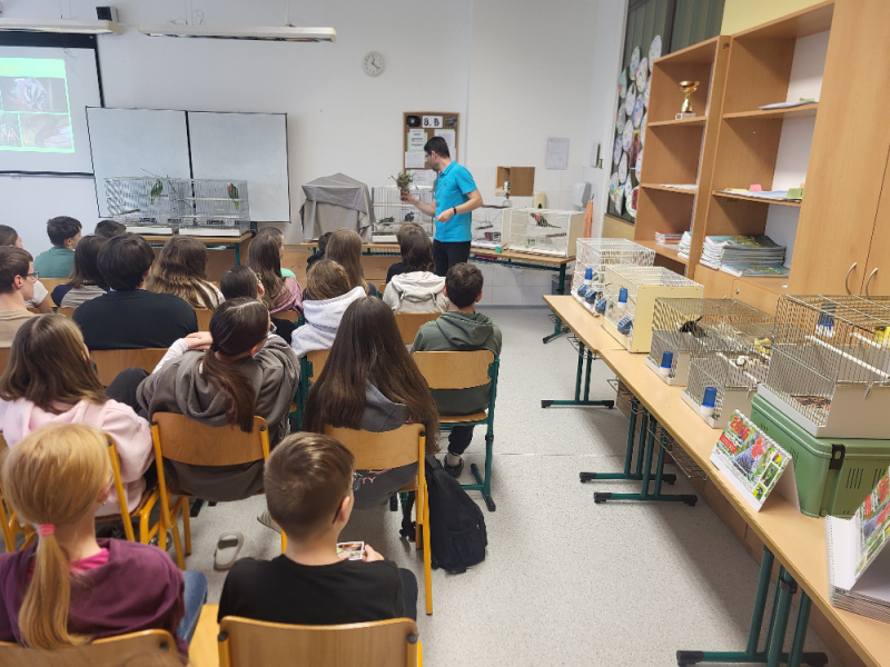 Dnes se 7. třídy zúčastnily díky paní učitelce Peřinové přednášky živého chovatelství. S dopomocí prezentace, krátkých videí, pohybových aktivit a živé expozice byly dětem představeny základní chované i vzácné druhy exotického ptactva. Živou expozici tvořilo 18 druhů o 28-32 jedincích. Dětem byla vysvětlena stavba ptačího těla, prostor byl i pro zajímavosti a zážitky z odborné praxe a také pro dotazy a případné sdílení chovatelských úspěchů dětí.