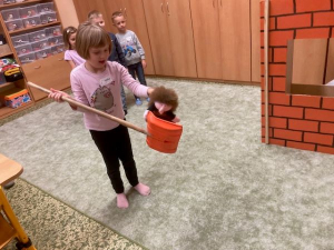 Velkým zážitkem bylo také zdobení perníčků geometrickými tvary podle instrukcí učitele. Děti si procvičily nejen tvary a barvy, ale i trpělivost a spolupráci. A protože pohádka musí mít napínavý konec, nechyběla ani dramatizace – ježibabu děti společně hodily do pece, samozřejmě jen „jako“ a s velkým smíchem.